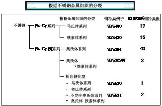 實際上,現在提供使用不銹鋼種類很多,在JIS標準(SUS記號)中達80種,若加上尚未被標準化的,廠商獨自的種類,其種類可達200種以上。不銹鋼在化學成分上,分類為Fe-Cr系列和Fe-Cr-Ni系列,進一步根據金屬組織分類,分出馬氏體系列、鐵素體系列、奧氏體系列、奧氏體·鐵素體系列(二相系列)及析出硬化型。如下圖表示根據不銹鋼的金屬組織分類以及代表性鋼種類名稱,SUS鋼種類的數量。
