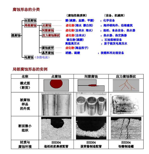 如上所述,不銹鋼通過在表面形成鈍態(tài)保護膜,而具有卓越的耐蝕性,但由于環(huán)境影響,其中被破壞的部分金屬溶解集中進行,形成局部腐蝕。其中,讓人擔心的腐蝕是與氯化物離子(Cl-)有關的局部腐蝕,特別在蝕坑處產(chǎn)生“點腐蝕”、在間隙結構處產(chǎn)生“間隙腐蝕”、因焊接等殘余應力的部位容易產(chǎn)生“應力腐蝕裂紋(SCC)”。這些腐蝕主要與氯等鹵化物離子有關,因電氣化學的反應而產(chǎn)生、擴大腐蝕。